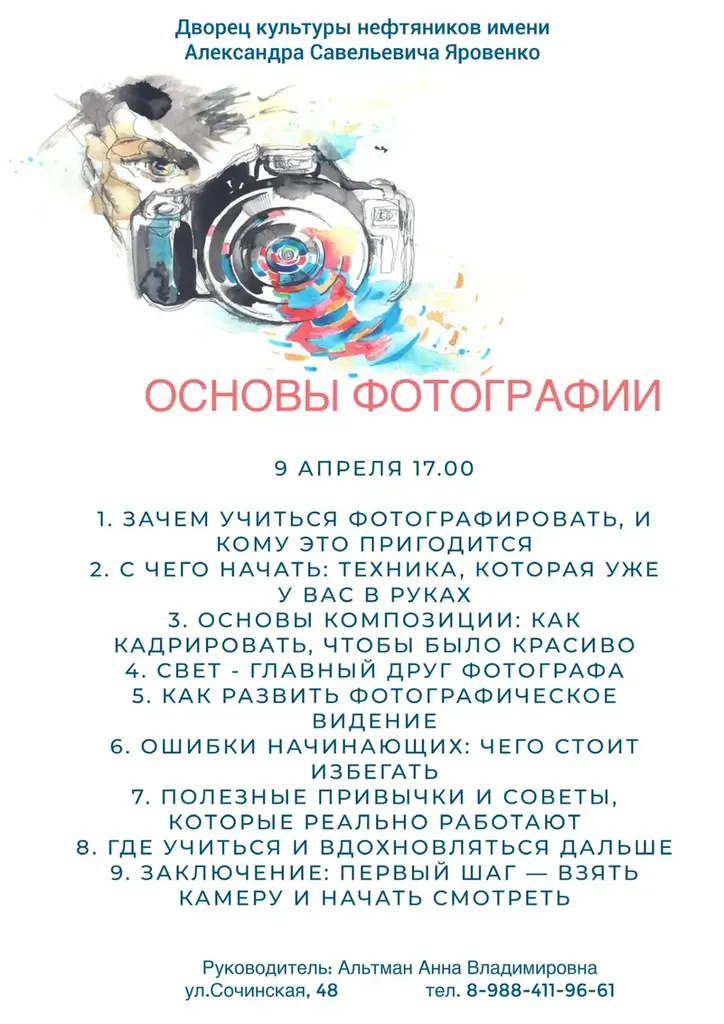 📸9 апреля в 17:00 всех любителей фото искусства приглашаем на мастер-класс «Основы фотографии» во Дворец культуры нефтяников.