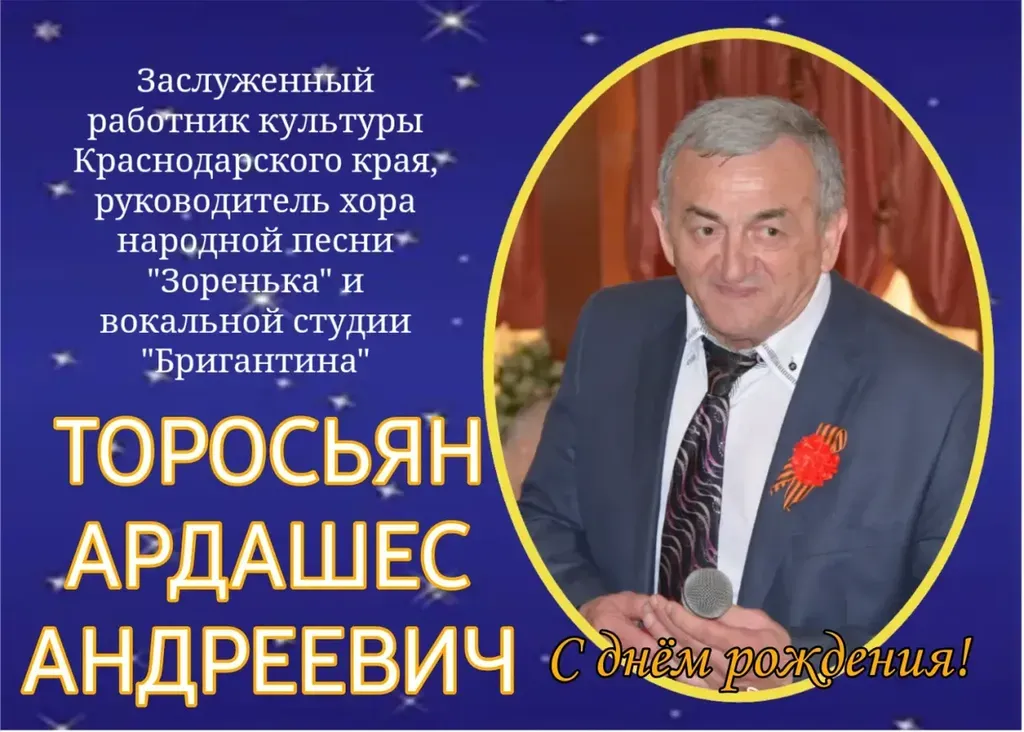 Поздравляем с юбилейным днём рождения Заслуженного работника культуры Краснодарского края, руководителя хора народной песни "Зоренька" и вокальной студии "Бригантина" Дворца культуры нефтяников им.А.С.Яровенко - Торосьян Ардашеса Андреевича!